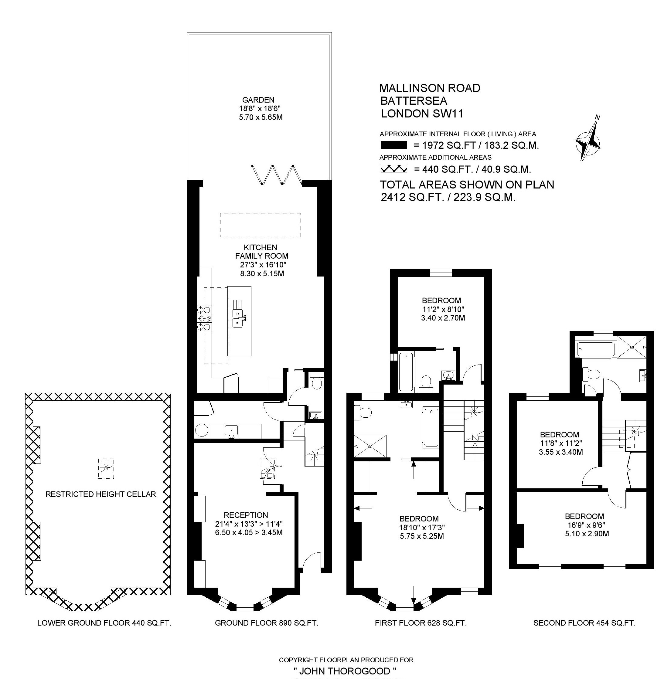 On the first floor, a first-class principal suite has been created using two large rooms to create a large main bedroom, complete with excellent dressing area and en suite bath/shower room. In addition, there are 3 further double bedrooms and two further bath shower rooms (one of which is also en suite). The fittings and finishes are of high-quality throughout the property. This rarer and earlier style of house enabled permission for a larger loft extension than can be obtained elsewhere that, unusually, can be square at front and back (a Double Mansard). This gives much better head-height throughout the new top floor. Running beneath the whole front of the property is a full size (albeit shallow) basement, which provides good storage but could also tempt any basement enthusiasts (not included in the square footage calculation above).