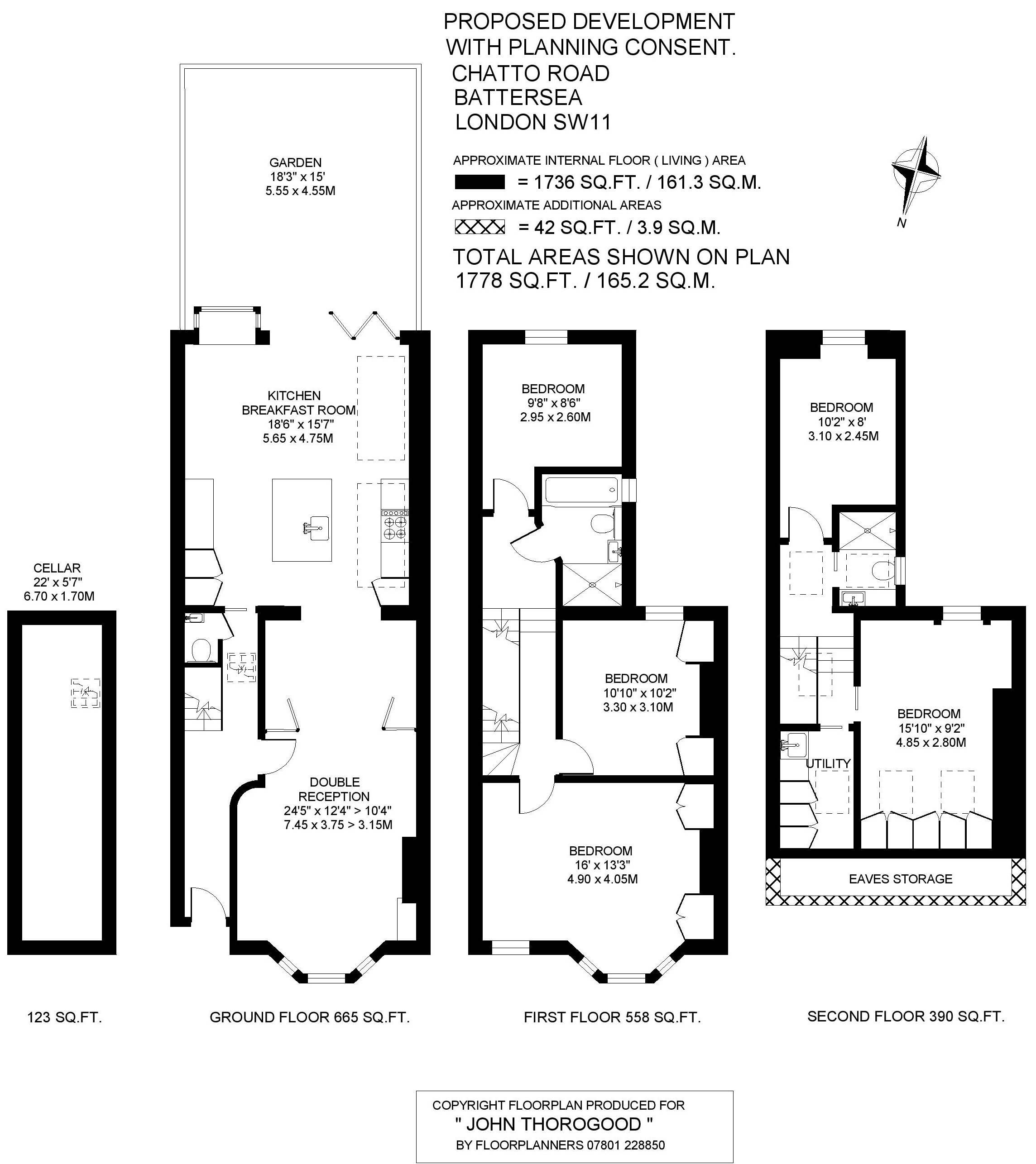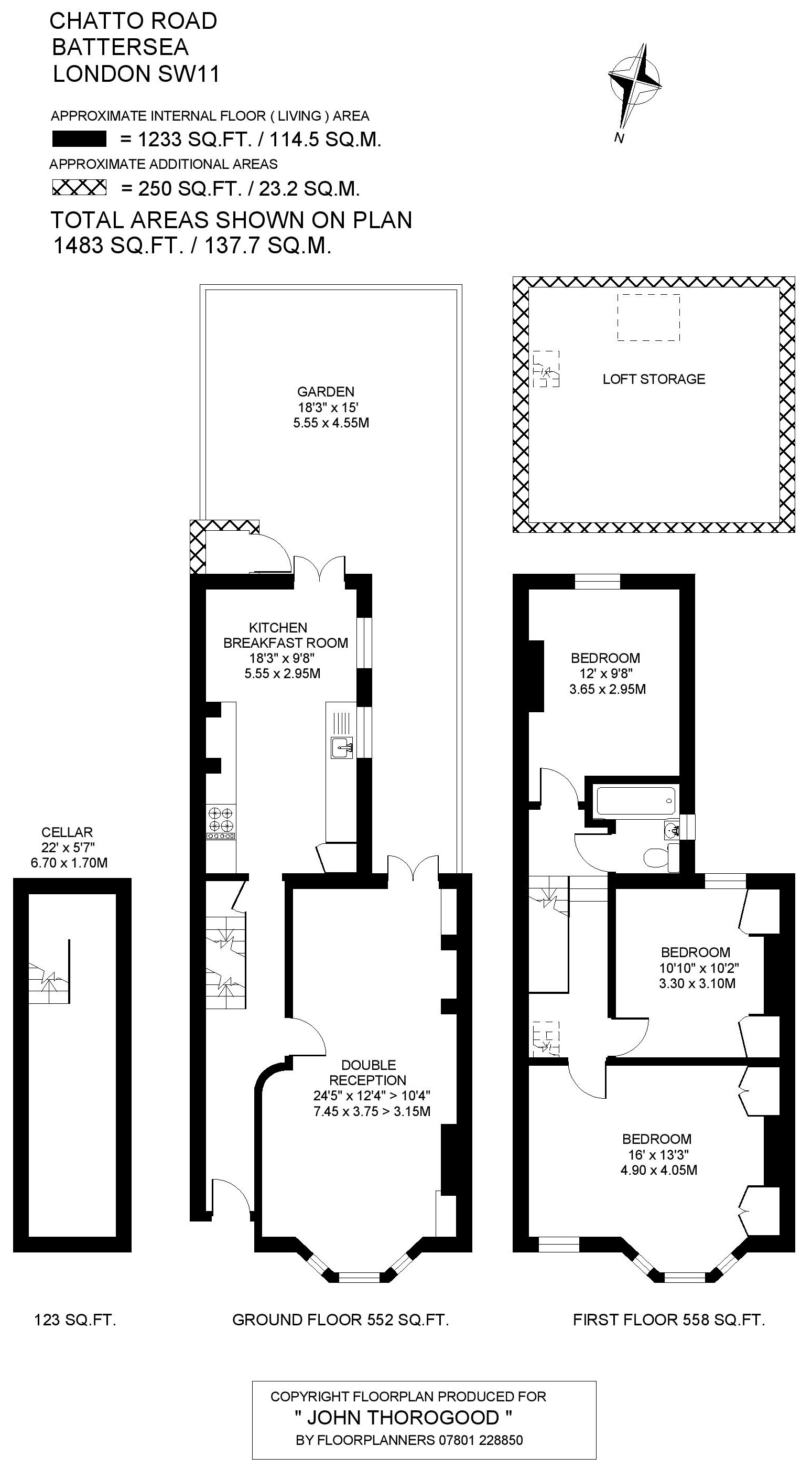 The existing house is equally a delightful option for those who have no interest in building work or development, ideal for downsizers or up-sizers looking to get a “freehold foothold” in the area. It is in attractive condition throughout, having been freshly redecorated and having had a new boiler in the spring of 2020 and the windows recently refurbished. The Victorian façade has been attractively restored, including a tessellated front path and the entrance hall from the small front garden, leads to a beautiful double reception with high ornate ceilings, stripped wood floors, a lovely original (and working) fireplace and a large front bay window which enjoys a nice open outlook. The hall also opens to the rear into a well-fitted and well-equipped kitchen/breakfast room with ample space for a table, nice, tiled floor and rear French windows to a sunny, private, south-facing garden. As the garden backs onto Thomas’ School’s large playgrounds, there is a very private feel and an open view with no properties behind. Furthermore, it is exceptionally quiet in school holidays, evenings and weekends. Upstairs are three double bedrooms and a modern family bath/shower room/WC. There is a useful storage cellar running beneath the hall whilst the main loft space has been adapted for use as a makeshift studio office (accessed via a ladder). It has been boarded out, has a single large Velux window and plenty of storage space. Note, this space is not included in the 1233 SQ.FT / 114.5 SQ.M on the floorplan.